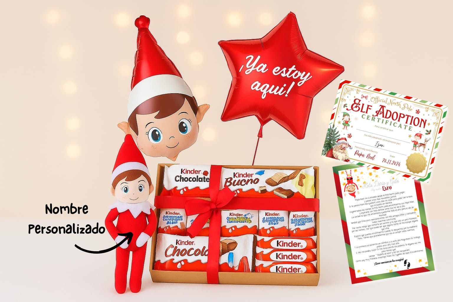 La magia crece con un globo de elfo que parece salido del Polo Norte y un globo estrella que ilumina el espíritu navideño. Pero eso no es todo: tu elfo llega con un certificado de adopción oficial, porque ahora formará parte de tu familia, y con una carta personalizada para Papá Noel para que los peques puedan enviarle sus deseos más profundos.